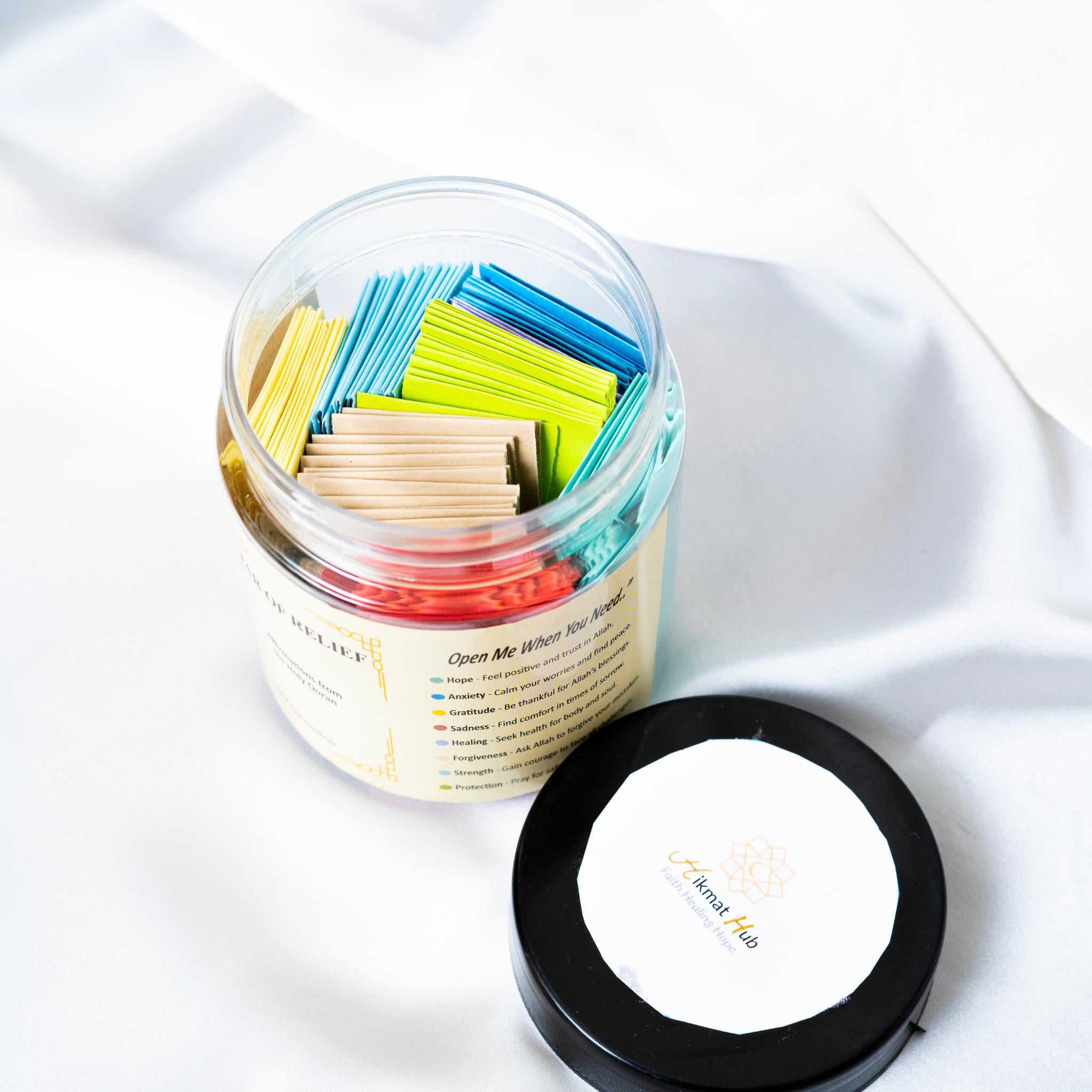 At Hikmat Hub, we believe in bringing the wisdom of the Holy Quran into your daily life. Our carefully crafted Jar of Relief offers authentic, easy-to-learn verses for every emotion—helping you find comfort, guidance, and peace whenever you need it.